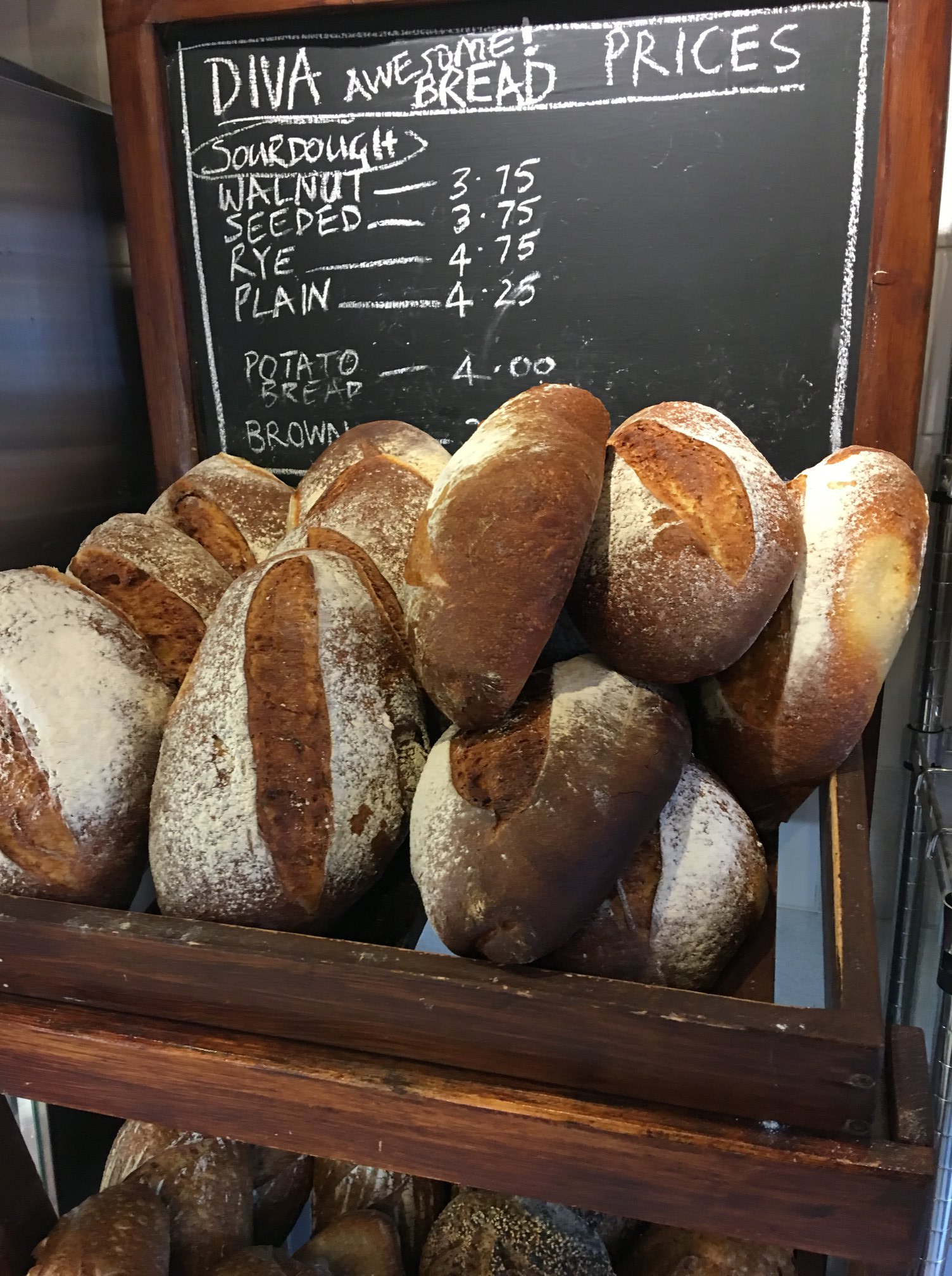 We sell daily: New York Style Rye(sourdough) Seeded Sourdough Walnut sourdough Wheaten Sourdough Honey porridge + oat Sourdough Golden Potato Bread Crust white Boule.